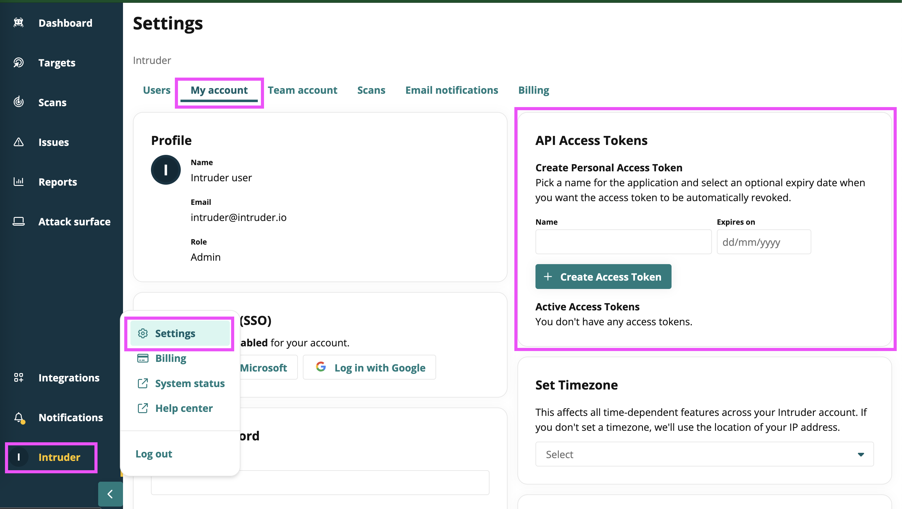 To generate a personal access token, head to the My account in the Intruder portal and locate to the API Access Tokens section.