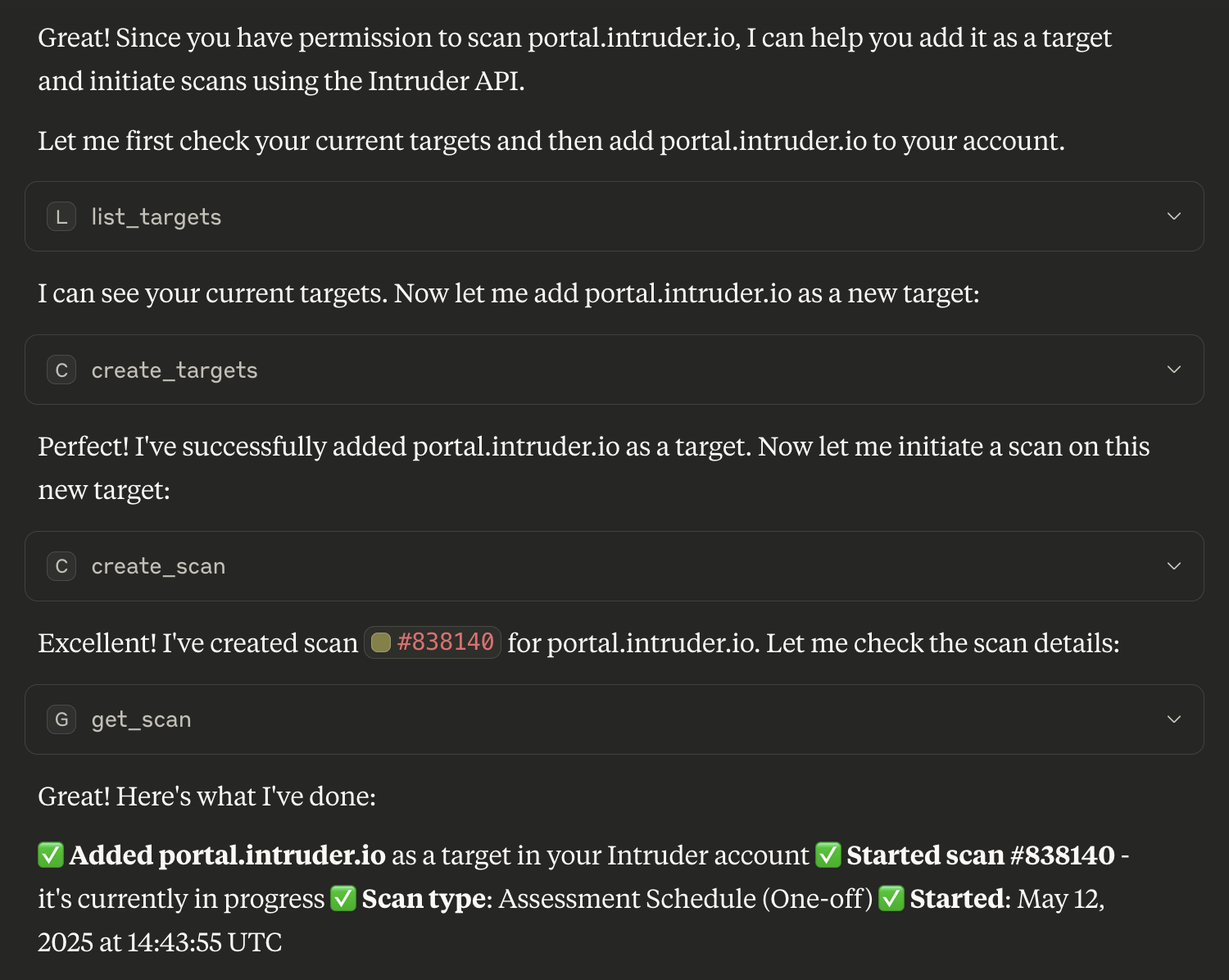 The agent will add the target, initiate the scan, and report back with the results.