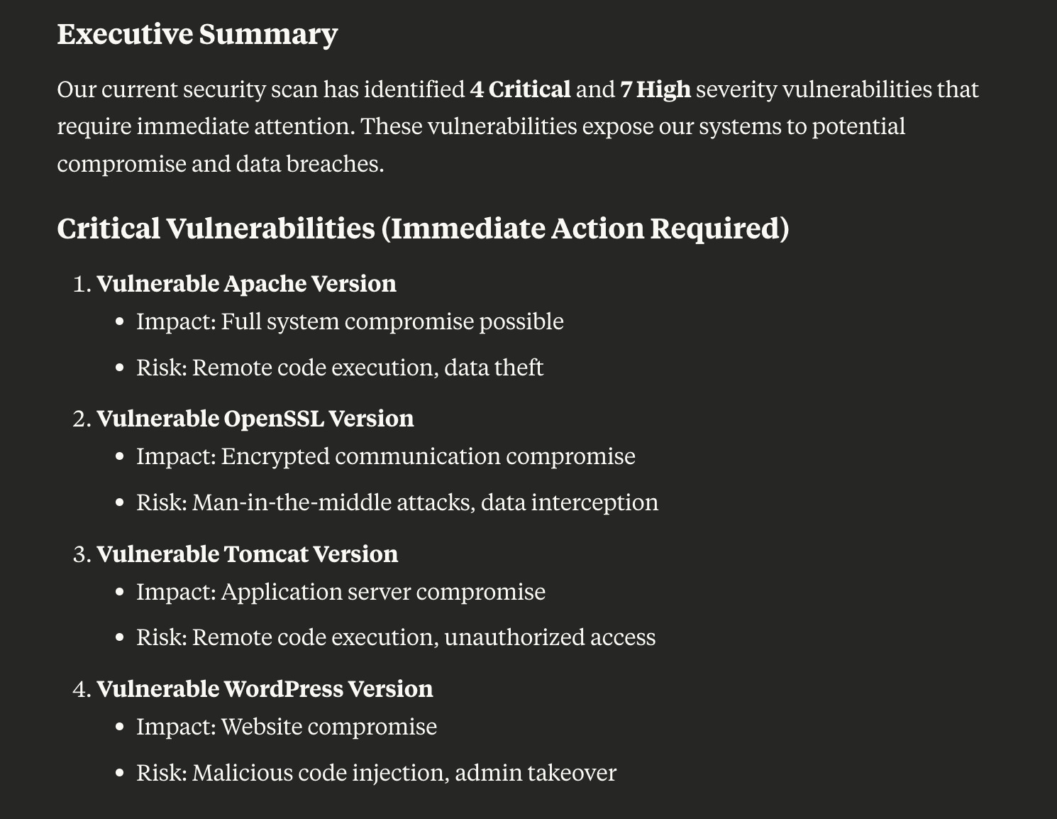 "Summarise our current vulnerabilities for the leadership team, highlighting critical issues and upcoming remediation plans."