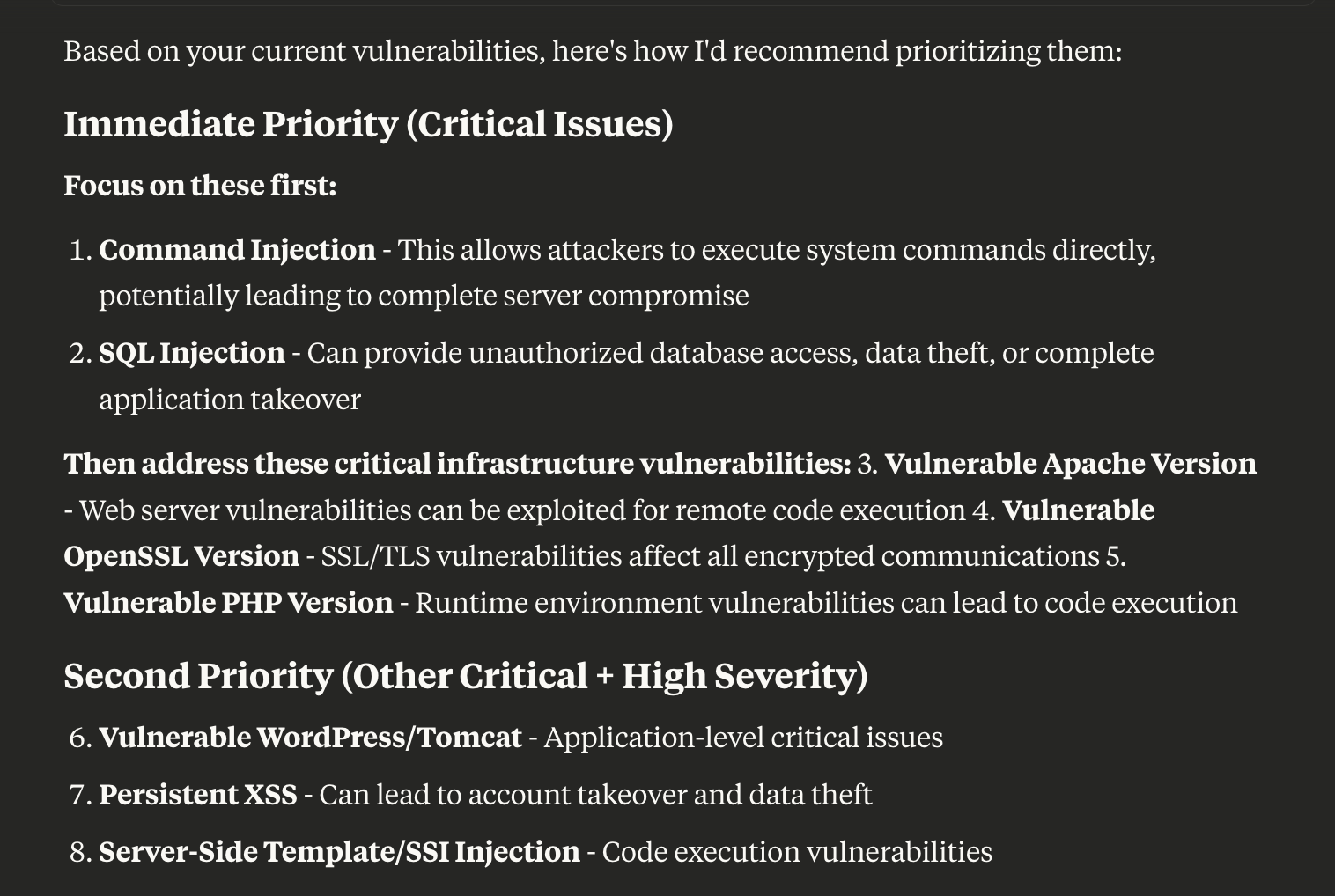 "Show me the critical vulnerabilities for our web apps, and suggest which to prioritise based on exploitability and potential business impact."